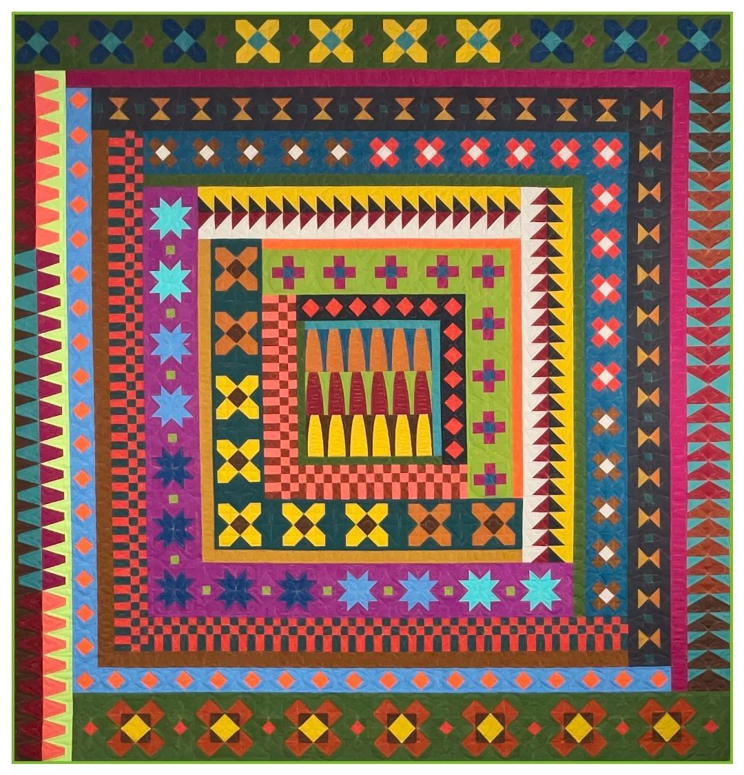 This medallion quilt is the perfect way to explore a beautiful harmony of colors and values, with a modern twist. Each round demonstrates a wide range of techniques that will build the skills of novice quilters and be a fun play day for the experts. Finished quilt size: 85" x 88".